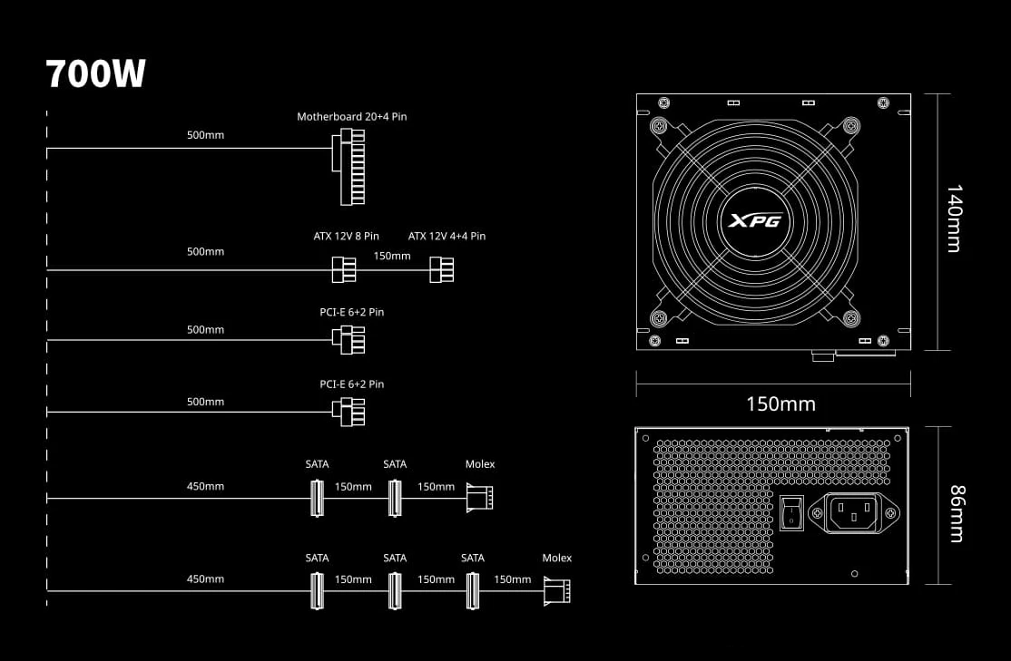 Distribución de carga: +5 V: 17 A | +3,3 V: 19 A | +12 V: 54 A | -12 V: 0,3 A | +5Vsb: 2,5 A